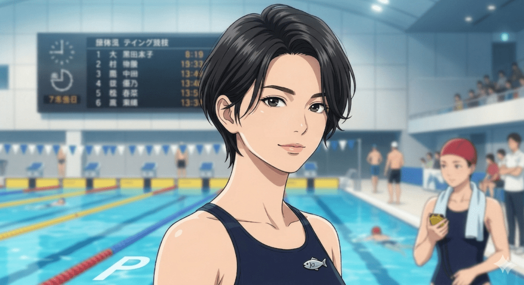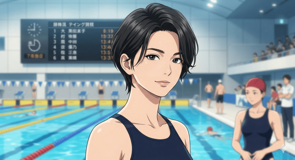- 右側の女性の手元に黄色いストップウォッチがある。